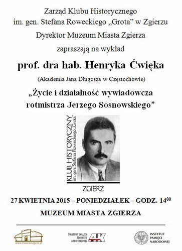 27 kwietnia (poniedziałek) 2015 r. o godz. 14:00 staraniem Muzeum Miasta Zgierza, Klubu Historycznego im. gen. Stefana Roweckiego „Grota” w Zgierzu oraz Oddziału Instytutu Pamięci Narodowej w Łodzi odbędzie się spotkanie podczas którego wykład pt. „Życie i działalność wywiadowcza rotmistrza Jerzego Sosnowskiego” wygłosi prof. dr hab. Henryk Ćwięk z Akademii Jana Długosza w Częstochowie. Spotkanie odbędzie się w Muzeum Miasta Zgierza, ul. Dąbrowskiego 21. Wstęp wolny! Zapraszamy!