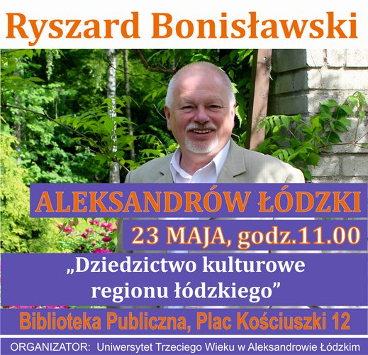 Uniwersytet Trzeciego Wieku działający przy Bibliotece Publicznej im Jana Machulskiego w Aleksandrowie Łódzkim zaprasza na sentymentalną podróż po województwie łódzkim z Ryszardem Bonisławskim pod hasłem "Dziedzictwo kulturowe regionu łódzkiego". Spotkanie odbędzie się 23 maja o godz. 11.00 w Czytelni Biblioteki. Wstęp wolny!
