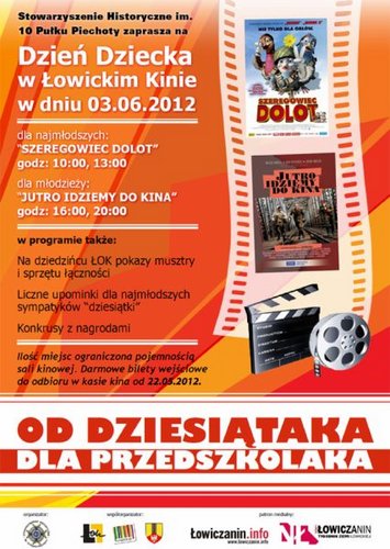 Stowarzyszenie Historyczne im. 10 Pułku Piechoty razem z Łowickim Ośrodkiem Kultury zaprasza na Dzień Dziecka w łowickim kinie Fenix, który zostanie zorganizowany 3.06.2012 r (niedziela).