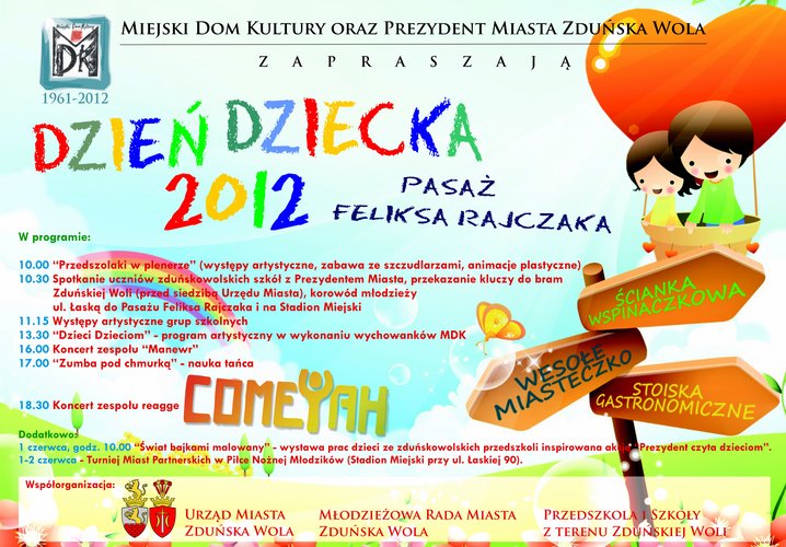 Miejski Dom Kultury i Prezydent Miasta Zduńska Wola zapraszają na Dzień Dziecka, który odbędzie się 1 czerwca w Pasażu Feliksa Rajczaka. Na dzieci czeka mnóstwo atrakcji: gry i zabawy, ścianka wspinaczkowa, występy artystyczne i koncerty.