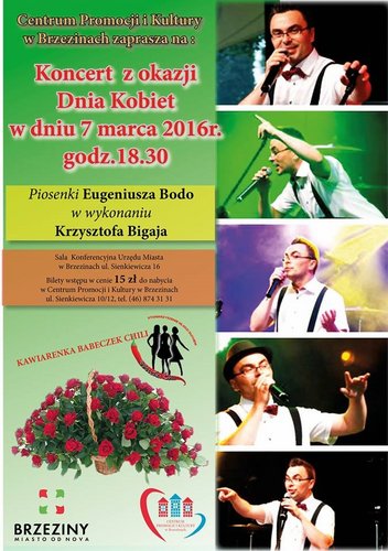 Centurm Promocji i Kultury w Brzezinach 7 marca o godz. 18.30 zaprasza na Dzień Kobiet z piosenkami z repertuaru Eugeniusza Bodo w wykonaniu Krzysztofa Bigaja. Koncert przybliży niezwykle bogatą postać artysty estradowego i aktora przedwojennego kina. Bilety w cenie 15 zł.