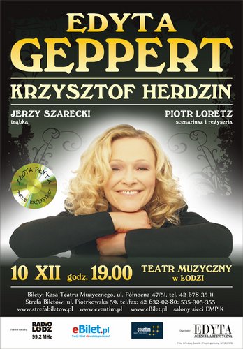 Edyta Geppert. Od lat zachwyca głosem o niezwykłej barwie, bardzo starannie dobranym repertuarem i mistrzowskimi interpretacjami. Kojarzona najczęściej z piosenkami "Zamiast", czy "Jaka róża, taki cierń"... Ale Edyta Geppert to nie tylko utwory dramatyczne; to również znakomita interpretatorka piosenek kabaretowych – o czym można przekonać się już niebawem – Artystka znów wystąpi przed łódzką publicznością! Żywiołem Edyty Geppert jest przede wszystkim scena i emocje związane z bezpośrednim kontaktem z publicznością. Znakomity warsztat idzie w parze z konsekwencją w doborze repertuaru, bez oglądania się na modę. Niezmiennie budzi te same skojarzenia – Artystka prawdziwa, niezależna, wierna swym ideałom i przekonaniom. Jej recital to gwarancja spotkania z piosenkami pisanymi przez samo życie i muzyką płynącą prosto z serca.
