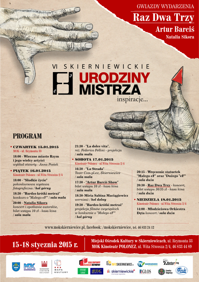 6. edycja festiwalu poświęconego twórczości włoskiego reżysera i scenarzysty filmowego Federico Felliniego eFeF Urodziny Mistrza Inspiracje odbędzie się w dniach 15-18 stycznia w Miejskim Ośrodku Kultury w Skierniewicach. Głównym wydarzeniem z maestro Federico w tle będzie konkurs filmowy Bardzo Krótki Metraż oraz fotograficzny pod wspólnym hasłem Słodkie Życie.