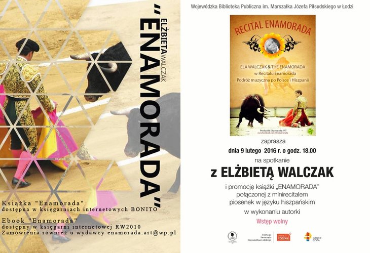 9 lutego 2016 r. o godz. 18.00 w sali konferencyjnej Wojewódzkiej Biblioteki Publicznej im. Marszałka J. Piłsudskiego w Łodzi (ul. Gdańska 100/102) odbędzie się spotkanie z Elżbietą Walczak, aktorką i producentką spektakli muzycznych. Spotkanie połączone będzie z promocją książki "Enamorada” i minirecitalem piosenek w języku hiszpańskim w wykonaniu autorki.