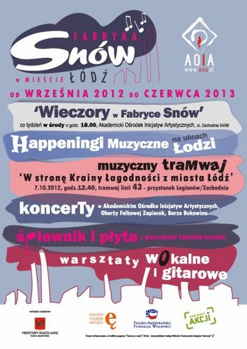 15 lutego 2013 o godz. 20:30 w Akademickim Ośrodku Inicjatyw Artystycznych w Łodzi w ramach projektu „Fabryka snów w mieście Łódź” – czyli „Kraina Łagodności” po łódzku odbędą się koncerty z udziałem wykonawców znanych ze scen piosenki turystycznej: