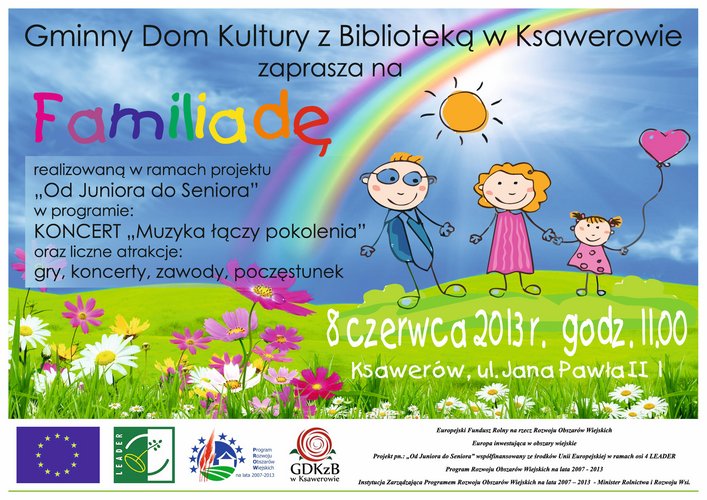 Gminny Dom Kultury z Biblioteką w Ksawerowie zaprasza na "Familiadę" realizowaną w ramach programu "Od juniora do seniora", która rozpocznie się 8 czerwca o godz. 11.00 w Ksawerowie przy ul. Jana Pawła II. W programie m.in.: koncert "Muzyka łączy pokolenia", gry, zawody i poczęstunek.