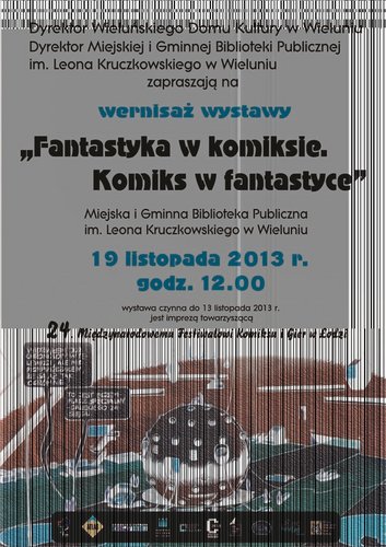 Dyrekcja Wieluńskiego Domu Kultury oraz Dyrektor Miejskiej i Gminnej Biblioteki Publicznej w Wieluniu zapraszają na wernisaż wystawy „Fantastyka w komiksie. Komiks w fantastyce”. Wydarzenie jest imprezą towarzyszącą 24. odsłony Międzynarodowego Festiwalu Komiksu i Gier w Łodzi. Wernisaż odbędzie się 19 listopada 2013 roku o godz. 12:00 w MiGBP w Wieluniu. Wystawę będzie można oglądać do 13 grudnia 2013r.
