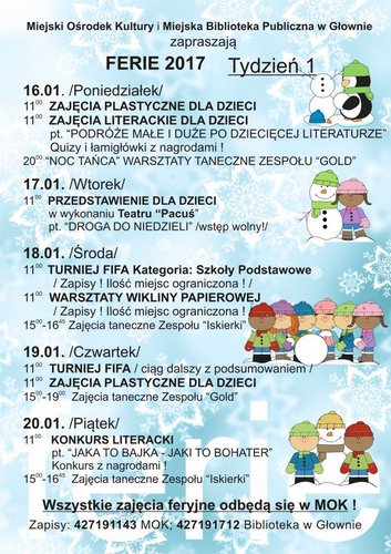 Miejski Ośrodek Kultury i Miejska Biblioteka w Głownie w dniach 16-27 stycznia zapraszają dzieci i młodzież na zajęcia organizowane w ramach ferii zimowych. W programie m.in.: warsztaty plastyczne, zajęcia taneczne, przedstawienia teatralne, turnieje gry FIFA, konkursy literackie i wiele innych atrakcji. Zapisy na zajęcia trwają!