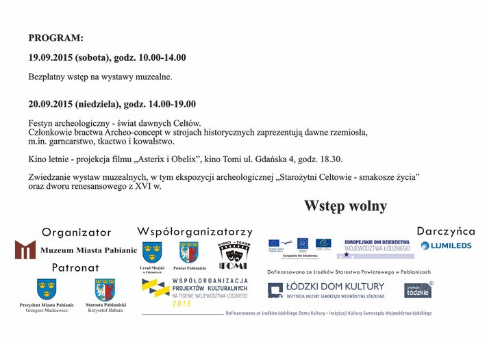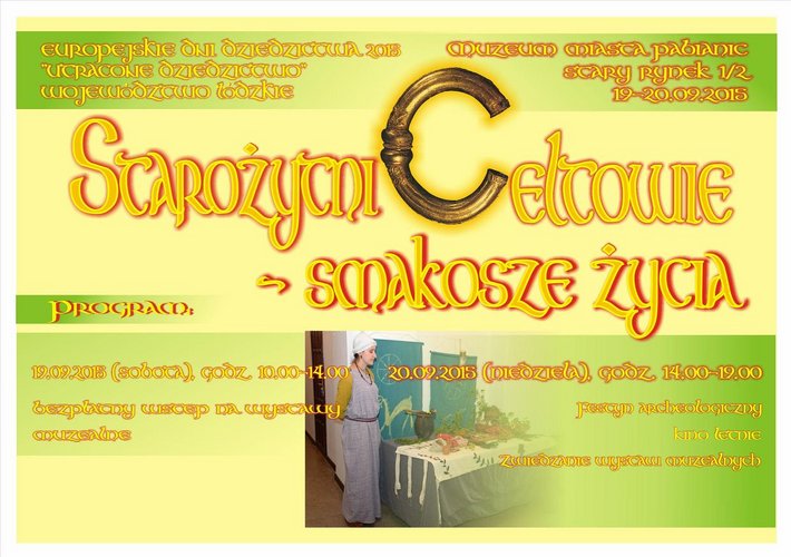 Jedyny w Polsce hełm późnoceltycki, rekonstrukcje życia dawnych Celtów i inne atrakcje czekają 20 września 2015 r. (niedziela) w godz. 14.00 - 19.00 w Muzeum Miasta Pabianic podczas Festynu archeologicznego "Starożytni Celtowie – smakosze życia”. Impreza plenerowa realizowana będzie w trakcie obchodów Europejskich Dni Dziedzictwa. Wstęp wolny!