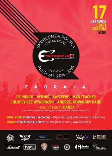 17 czerwca w Łodzi odbędzie się kolejny lokalny finał Emergezna Festival Polska - największego na świece festiwalu dla młodych zespołów bez kontraktów płytowych! Grupa, który wygra finał krajowy weźmie udział w finale światowym w Niemczech na Tauberta Open Air Festival! W Łódzkim Domu Kultury, już w najbliższy piątek, zagrają: DE INDIGO, VERMIS, KAYCEEBE, CHŁOPCY BEZ WYOBRAŹNI, ANDRZEJ KOWALSKY BAND i MAD TEACHER. Gościem specjalnym będzie HANZA!