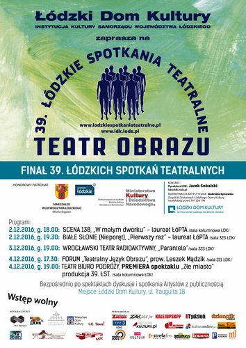 W dniach 2-4 grudnia w Łódzkim Domu Kultury odbędzie się finał 39. edycji Łódzkich Spotkań Teatralnych Teatr obrazu. W piątek (2 XII) będziemy mogli zobaczyć spektakle nagrodzone na 29. Łódzkim Przeglądzie Teatrów Amatorskich – ŁóPTA 2016: W małym dworku grupy teatralnej Scena 138 z Gdyni (godz. 18.00) oraz Pierwszy raz grupy Białe Słonie z Nieporętu (godz. 19.30). Sobotni wieczór rozpocznie się prezentacją wizualnego słuchowiska Parantela Wrocławskiego Teatru Radioaktywnego z udziałem aktorów, muzyków i malarki. Teatralne święto zakończy w niedzielę Forum Teatralny język obrazu poprowadzone przez Leszka Mądzika (godz. 17.30) oraz premiera Teatru Biuro Podróży pt. Złe miasto (godz. 19.00), przygotowana specjalnie na Łódzkie Spotkania Teatralne.