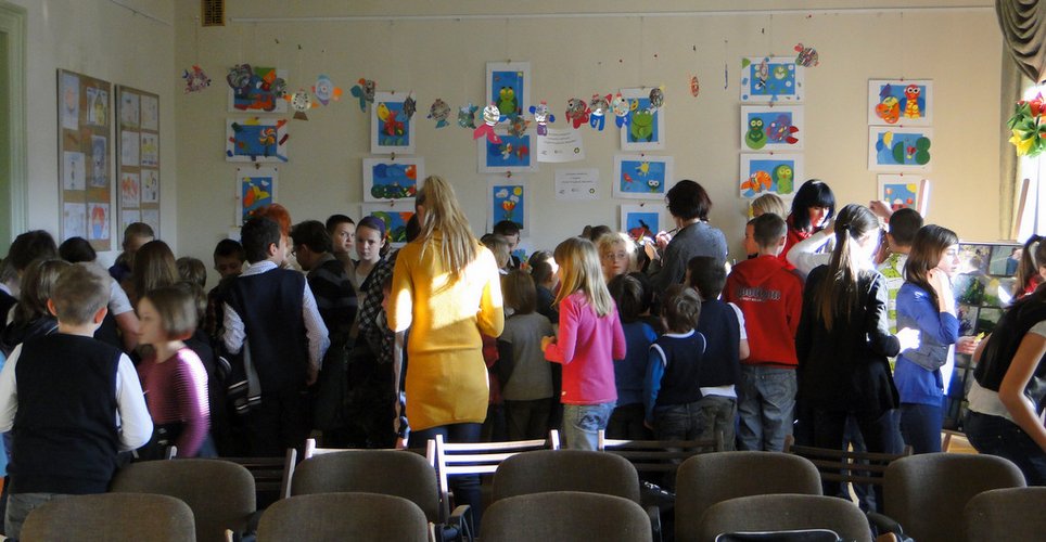 Zaproszeni goście – dzieci, które brały udział w poszczególnych częściach Projektu miały okazję spotkać się po raz ostatni wspólnie w szerokim gronie rówieśników. Nawet sala „Wystawiennicza” okazała się być za mała dla zgromadzonych uczestników i ich opiekunów. Sala na dzisiejsze święto została odpowiednio zaaranżowana – na ścianach, na stolikach i w gablotach zostały wyeksponowane wszystkie prace dzieci, wykonane podczas realizacji Projektu. Najpierw goście mogli przypomnieć sobie (lub poznać) przebieg wszystkich warsztatów i zajęć, które odbywały się w bibliotece – oglądając prezentację multimedialną. Troszkę zawstydzeni odszukiwali siebie na kolejnych slajdach prezentacji.