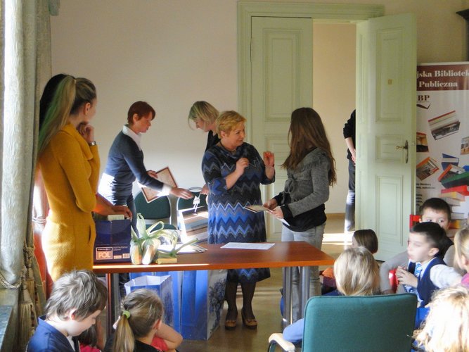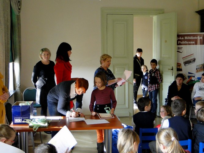 W czasie, gdy Organizatorzy liczyli głosy, zaproszeni goście wysłuchali fragmentów książki Janusza Korczaka pt. „Bankructwo Małego Dżeka”. Na zakończenie spotkania zwycięzcy - z rąk Pani Dyrektor Biblioteki Ewy Adamskiej – odebrali dyplomy nagrody. Przyznano w każdej kategorii miejsca od I do III oraz wyróżnienia – których łącznie wręczono 16.