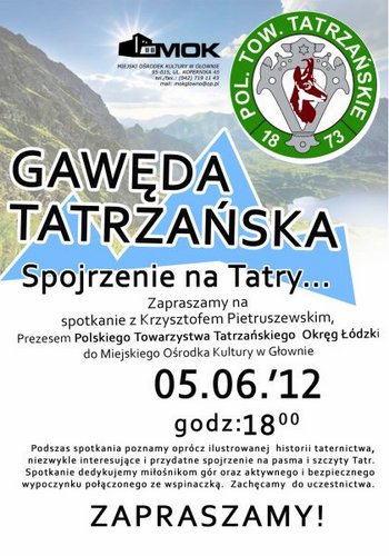 Wiosna w pełni sprzyja kreśleniu wakacyjnych planów wyjazdowych. Wiele osób za cel podróży wybiera góry. Dla wszystkich, którzy chcą poszerzyc swoją wiedzę o górach, zwłaszcza Tatrach, serdecznie zapraszamy na "Gawędę Tatrzańską". Zapraszamy 5 czerwca o godzinie 18-stej do MOK Głowno