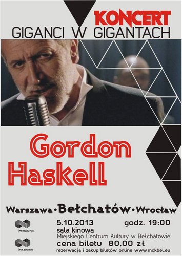 Miejskie Centrum Kultury w Bełchatowie zaprasza na koncert jednego z członków legendarnej grupy King Crimson - Gordona Haskella, który rozpocznie cały cykl wydarzeń "Giganci w Gigantach". Koncert odbędzie się 5 października o godz. 19.00 w sali kinowej MCK. Bilety w cenie 80 zł.