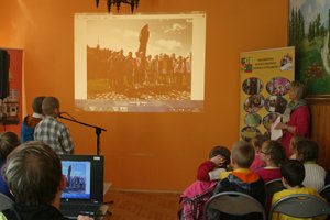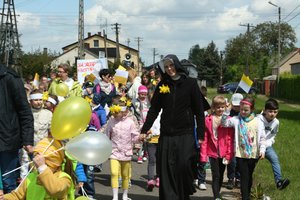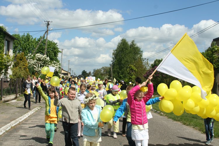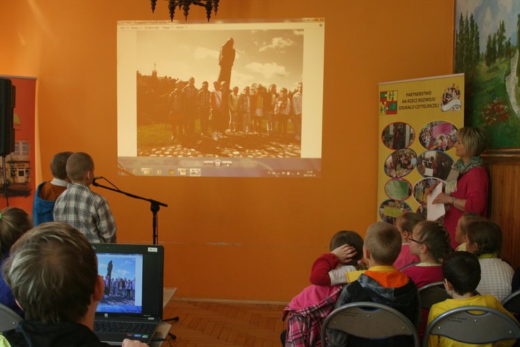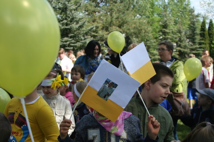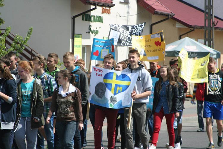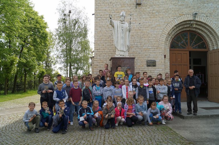 Po części artystycznej młodzi uczestnicy udali się autokarami szkolnymi do kościoła w Dzierżawach, gdzie proboszcz, ks. kan. Marian Kilichowski opowiedział o historii parafii, o jej związkach ze św. Faustyną oraz o swoich zetknięciach ze św. Janem Pawłem II. Spotkanie zakończyło się konkursem wiedzowym z nagrodami oraz słodkościami, którymi Gospodarz uraczył swoich gości, a także wspólnym zdjęciem przy pomniku św. Jana Pawła II. Było ciekawie i sympatycznie!