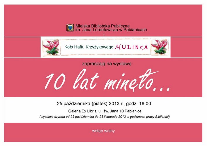 Miejska Biblioteka Publiczna im. Jana Lorentowicza w Pabianicach serdecznie zaprasza na wystawę prac członkiń Koła Haftu Krzyżykowego „Mulinki”. Otwarcie w środę 25 października, w budynku Biblioteki przy ul. św. Jana 10, w Galerii Ex Libris.
