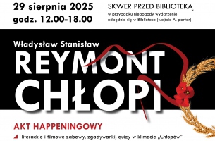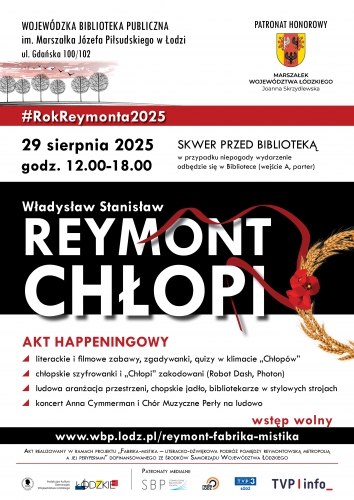 Wojewódzka Biblioteka Publiczna im. Marszałka Józefa Piłsudskiego w Łodzi zaprasza 29 sierpnia 2025 r. w godz. 12.00-18.00 na happening z Jagną i Boryną - w stylu powieści „Chłopi” W. S. Reymonta.
