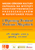 Miejski Ośrodek Kultury w Konstantynowie Łódzkim od stycznia realizuje w placówkach przedszkolnych zajęcia taneczne poświęcone folklorowi miejskiemu. Podsumowaniem warsztatów będzie zorganizowany po raz pierwszy w Konstantynowie Łódzkim Dziecięcy Festiwal Tańca, który odbędzie się 16 maja o godz. 11:00 w Miejsko-Szkolnej Hali Sportowej przy Szkole Podstawowej Nr 5 w Konstantynowie Łódzkim.