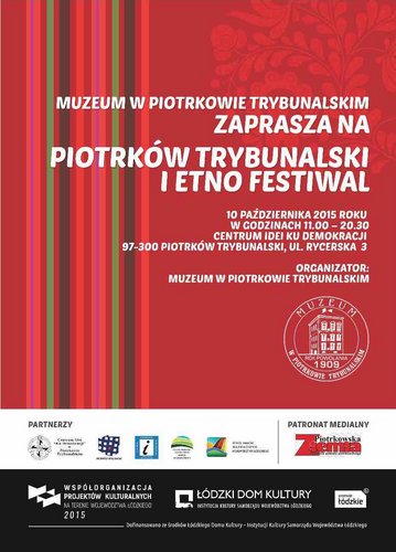 10 października Muzeum w Piotrkowie Trybunalskim wraz partnerami projektu: Centrum Idei Ku Demokracji, Centrum Informacji Turystycznej w Piotrkowie Trybunalskim, Zespołem Nadpilicznych Parków Krajobrazowych, patronem medialnym gazetą „Ziemia Piotrkowska” przy wsparciu Łódzkiego Domu Kultury otrzymanego w ramach „Współorganizacji projektów kulturalnych na terenie województwa łódzkiego 2015” , serdecznie zaprasza na: „PIOTRKÓW TRYBUNALSKI – I ETNO FESTIWAL”.