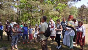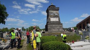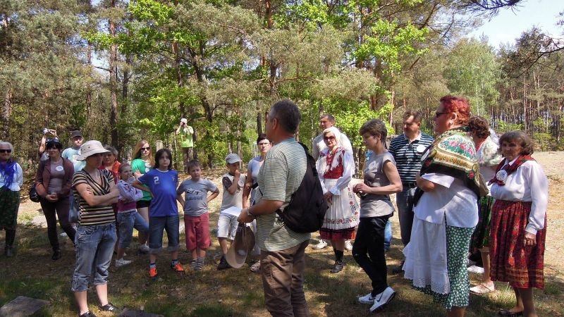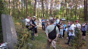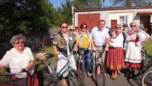 Panie z Koła Gospodyń w Grabnie, w ludowych strojach, na rowerach, z panią sołtys Jolantą Siwek na czele zaskoczyły nas kompletnie. Nastąpiło bardzo serdeczne powitanie obu grup, które, już połączone udały się na cmentarz poległych żołnierzy z 1914 r., aby oddać hołd i zapalić znicze. Z kolei nastąpiła prelekcja pana sekretarza, który przedstawił historię poległych, a także relacje miejscowych, dotyczącą liczby pochowanych.