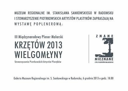 Muzeum Regionalne im. Stanisława Sankowskiego w Radomsku oraz Stowarzyszenie Piotrkowskich Artystów Plastyków zapraszają na wernisaż wystawy III Międzynarodowego Pleneru Malarskiego „KRZĘTÓW – WIELGOMŁYNY 2013r. Z CYKLU ZNANE – NIEZNANE” w dniu 6 grudnia 2013r. (piątek) o godz. 18.00, Galeria Muzeum, ul. Narutowicza 1.
