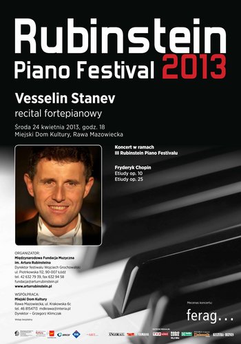 W ramach III Rubinstein Piano Festiwal 2013 w dniu 24 kwietnia o godz 18.00 w Miejskim Domu Kultury w Rawie Mazowieckiej odbędzie się recital fortepianowy. Vesselin Stanev wykona Etiudy z op.10 i 25 Fryderyka Chopina. Wstęp bezpłatny.