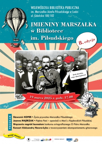 Wojewódzka Biblioteka Publiczna im. Marszałka Józefa Piłsudskiego w Łodzi zaprasza na 8. edycję „Imienin Marszałka w Bibliotece im. Piłsudskiego”, która odbędzie się 19 marca 2025 roku o godzinie 17.00 w sali konferencyjnej Biblioteki (II piętro).