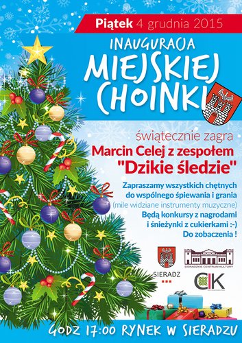 W piątek 4 grudnia o godz. 17.00 na Rynku w Sieradzu odbędzie się inauguracja Miejskiej Choinki! Świątecznie zagra Marcin Celej z zespołem "Dzikie śledzie". W programie konkursy z nagrodami i śnieżynki z cukierkami!