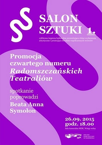 26 września rozpoczniemy cykl spotkań ph. "Salon sztuki". To cykliczna impreza kulturalna prezentująca różne wydarzenia artystyczne i promująca dorobek współczesnych twórców. Salon zainauguruje promocja "Radomszczańskich Teatraliów" nr 4 oraz spotkanie z redaktorką pisma Beatą Anną Symołon. Sala kameralna, 26 września 2015, godz. 18.00