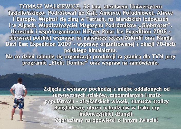 TOMASZ WALKIEWICZ, 32 lata, absolwent Uniwersytetu Jagiellońskiego. Podróżował po Azji, Ameryce Południowej, Afryce i Europie. Wspinał się zimą w Tatrach, na islandzkich lodowcach i w Alpach. Współzałożyciel Magazynu Podróżników "Globtroter". Uczestnik i współorganizator HiFlyer Polar Ice Expedition 2008 - pierwszej polskiej wyprawy na najwyższy szczyt Arktyki oraz Nanda Devi East Expedition 2009 - wyprawy organizowanej z okazji 70-lecia polskiego himalaizmu. Na co dzień zajmuje się organizacją produkcji za granicą dla TVN przy programie "Efekt Domina" oraz wypraw na zamówienie.