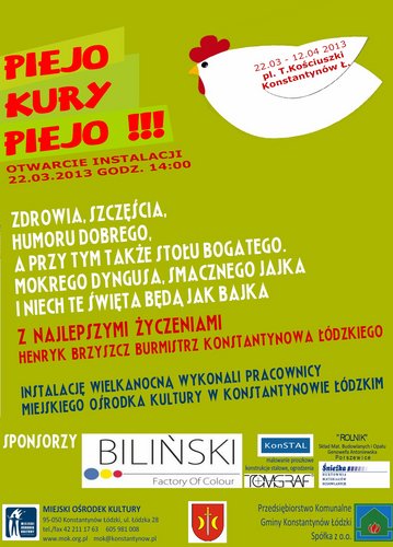 Miejski Ośrodek Kultury w Konstantynowie Łódzkim jest pomysłodawcą instalacji przestrzennych prezentowanych z okazji ważnych świąt i wydarzeń. Z okazji nadchodzących świąt wielkanocnych zapraszamy na otwarcie instalacji pt: „Piejo kury piejo”. Ogromna 6-cio metrowa kura siedząca na pomalowanych w złotym kolorze pisankach, baranek, zając. Zapraszamy 22 marca 2013r. o godz. 14:00 na Plac T. Kościuszki w Konstantynowie Łódzkim. Instalacja potrwa do 12 kwietnia 2013r.