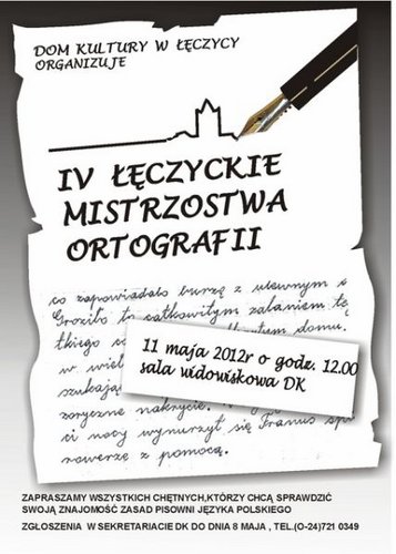 Dom Kultury w Łęczycy zaprasza do udziału w IV Łęczyckich Mistrzostwach Ortografii! Spotkanie odbędzie się 11 maja o godz. 12.00 w Domu Kultury w Łęczycy.