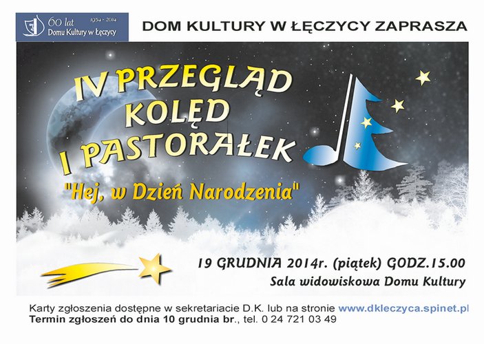 Dom Kultury w Łęczycy zaprasza solistów, duety, zespoły wokalne i wokalno-instrumentalne, a także chóry i osoby niezrzeszone do udziału w Przeglądzie Kolęd i Pastorałek pod nazwą Hej w Dzień Narodzenia, który odbędzie się 19 grudnia o godz. 15.00 w sali widowiskowej. Zgłoszenia trwają!
