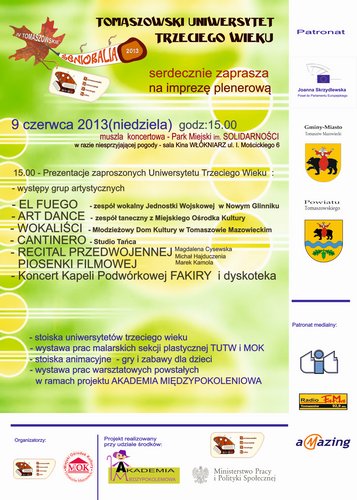 Na zakończenie imprezy wystąpi zespół Fakiry oraz odbędzie się dyskoteka na świeżym powietrzu. Poza tym, w Parku Miejskim uniwersytety trzeciego wieku będą prezentować swoją działalność (stoiska, prezentacje sceniczne), będzie można także zobaczyć wystawę prac malarskich sekcji plastycznej TUTW i MOK, wystawę prac warsztatowych powstałych w ramach projektu "Akademia Międzypokoleniowa" (realizowanego przez TUTW ze środków Ministerstwa Pracy i Polityki Społecznej, w ramach I edycji Rządowego Programu na rzecz Aktywności Społecznej Osób Starszych na lata 2012-2013 (ASOS). Wystawa prac powstałych podczas tego projektu jest szczególnie interesująca, ponieważ zobaczyć będzie można: rzeźbę ze złomu, rzeźbę z wikliny, gigantyczny komiks dotyczący relacji międzypokoleniowych oraz rękodzieło (linoryt, kwiaty z papieru etc).