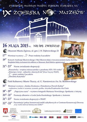 Muzeum Miasta Zgierza w Noc Muzeów 16 maja zaprasza m.in. na wernisaż wystawy „44”, koncert Andrzeja Sikorowskiego i Mai Sikorowskiej, a także na nocne zwiedzanie ekspozycji: „Kruszówka wnętrza mieszczańskie z przełomu XIX i XX w.”, „Dziecięcy świat – zabawki z dawnych lat”. W Mieście Tkaczy będzie można zobaczyć wystawy: „Sztuka Zrodzona z Dziedzictwa Dwóch Kultur” i "Pajęczyna czasu". A na zakończenie: Prezentacja i pokaz konserwacji mebli zabytkowych w Centrum Konserwacji Drewna.
