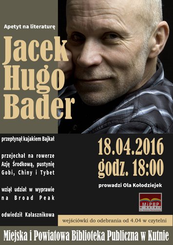 18 kwietnia o godzinie 18:00 w Miejskiej i Powiatowej BIbliotece Publicznej w Kutnie odbędzie się spotkanie z Jackiem Hugo Baderem, który przepłynął kajakiem Bajkał, przejechał na rowerze Azję Środkową, pustynię Gobi, Chiny i Tybet, wziął udział w wyprawie na Broad Peak i odwiedził Kałasznikowa. Spotkanie prowadzi Ola Kołodziejek.