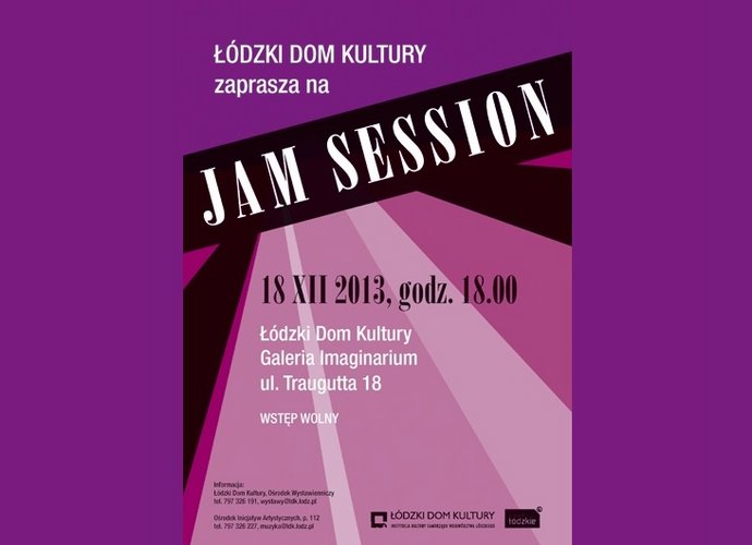 JAM SESSION w Imaginarium, to nowa propozycja cyklicznych muzycznych spotkań w Galerii Imaginarium Łódzkiego Domu Kultury z udziałem utalentowanych artystycznie instrumentalistów. Zapraszamy zatem do udziału wszystkich chętnych, których pasja i zdolności artystyczne inspirują do wspólnego muzykowania. Pragniemy, aby spotkania jazzowe odbywały się w miejscu, gdzie promowane są sztuki wizualne, instalacje oraz artystyczna fotografia. Galeria Imaginarium, to odpowiednie miejsce do wspólnej kreacji sztuk plastycznych i „żywej” muzyki. Zapraszamy wstęp wolny!