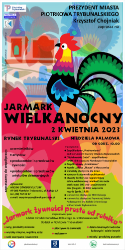 MOK Piotrków zaprasza do współpracy wszystkich rękodzielników, artystów, rzemieślników oraz twórców ludowych do zaprezentowania swoich wyrobów na Jarmarku Wielkanocnym. Szczególnie mile widziani są wystawcy oferujący ręcznie robione ozdoby i dekoracje świąteczne. Zgłoszenia prosimy wysyłać na adres merytoryczny@mok.piotrkow.pl.
