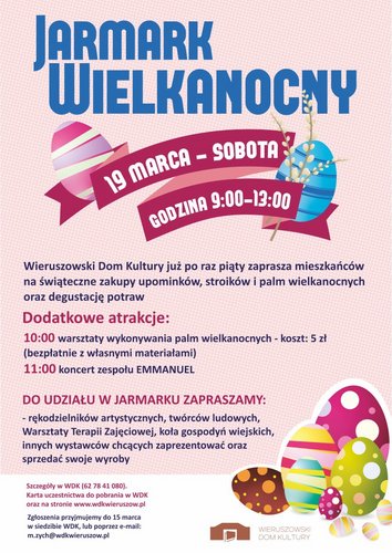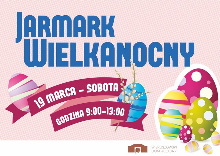 19 marca w Wieruszowskim Domu Kultury odbędzie się już piąta edycja Jarmarku Wielkanocnego. Odwiedzający, jak co roku, będą mieli okazję do zakupienia świątecznych upominków, ozdób i palm wielkanocnych oraz do degustacji potraw. Ponadto w programie: warsztaty z robienia palm wielkanocnych i koncert lokalnego zespołu Emmanuel.