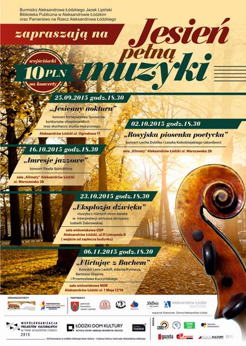 (projekt „Jesień pełna muzyki” realizowany jest przy wsparciu ŁDK w ramach „współorganizacji projektów kulturalnych województwa łódzkiego 2015” oraz Gminy Aleksandrów Łódzki, pod patronatem Burmistrza Jacka Lipińskiego)