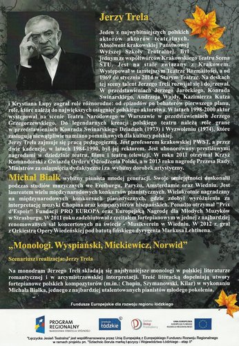 Gmina Miasto Łęczyca, Muzeum w Łęczycy oraz Klasztor OO. Bernardynów w Łęczycy w ramach „Łęczyckiej jesieni teatralnej” serdecznie zapraszają na spektakl „Monologi. Wyspiański, Mickiewicz, Norwid” w wykonaniu jednego z najwybitniejszych aktorów teatralnych - Jerzego Treli. Artyście towarzyszyć będzie wybitny pianista młodej generacji – Michał Białk.