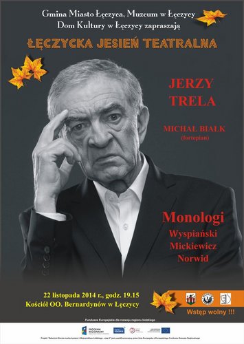 Gmina Miasto Łęczyca, Muzeum w Łęczycy oraz Klasztor OO. Bernardynów w Łęczycy w ramach „Łęczyckiej jesieni teatralnej” serdecznie zapraszają 22 listopada o godz. 19.15 na spektakl „Monologi. Wyspiański, Mickiewicz, Norwid” w wykonaniu jednego z najwybitniejszych aktorów teatralnych - Jerzego Treli. Artyście towarzyszyć będzie wybitny pianista młodej generacji – Michał Białk. Wstęp wolny!