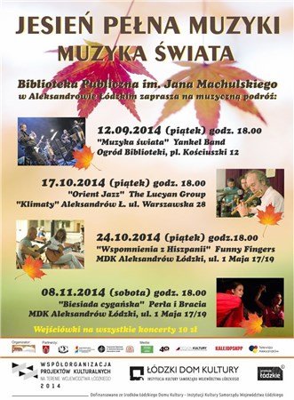 Biblioteka Publiczna im. J. Machulskiego w Aleksandrowie Łódzkim oraz Partnerstwo na rzecz Aleksandrowa zapraszają na koncerty z cyklu "Jesień pełna muzyki. Muzyka świata".