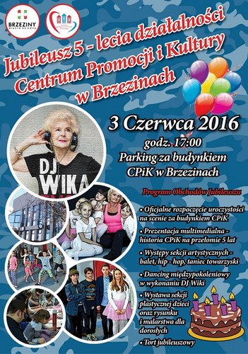 Centrum Promocji i Kultury w Brzezinach w tym roku obchodzi 5 – lecie swojej działalności. Z tej okazji 3 czerwca o godz. 18.00 zaprasza na dancing międzypokoleniowy, który poprowadzi najpopularniejsza polska didżejka, odznaczająca się znakomitą zdolnością zjednywania ludzi w różnym wieku oraz umiejętnościami prowadzenia imprez tanecznych - DJ Wika. W programie także pokazy sekcji tanecznych, prezentacje i wystawy. Wstęp na imprezę bezpłatny.