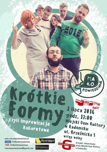 2 lipca o godz. 17.00 Miejski Dom Kultury w Radomsku zaprasza na podsumowanie projektu Kabaretowe Radomsko - Małe Granty MDK. W programie: Krótkie formy, czyli improwizacje kabaretowe - występ Teatru Improwizacji TO MAŁO POWIEDZIANE. Krótkie formy do spektakl, na który składa się kilkanaście gier komediowych. Gry te nie posiadają żadnego scenariusza, są oparte na sugestiach publiczności. Wstęp wolny!