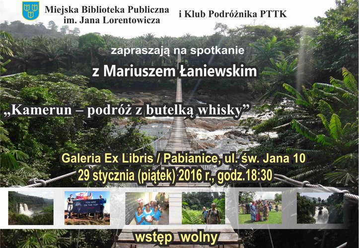 Trwa projekt "Cała Afryka!", którego celem jest odwiedzenie wszystkich afrykańskich państw. Na razie na liście jest ich 13. Już 29 stycznia o godz. 18.30 w Galerii "Ex Libris" Miejskiej Biblioteki Publicznej im. Jana Lorentowicza w Pabianicach posłuchamy opowieści o ostatniej podróży Mariusza Łaniewskiego, który wraz z towarzyszącą mu ekspedycją odwiedził Kamerun. Będzie m.in. o „dramatycznych” wydarzeniach na kameruńskiej plaży, spotkaniach z „dziką zwierzyną” w dżungli, o albinosach, górach i nocnych klubach...