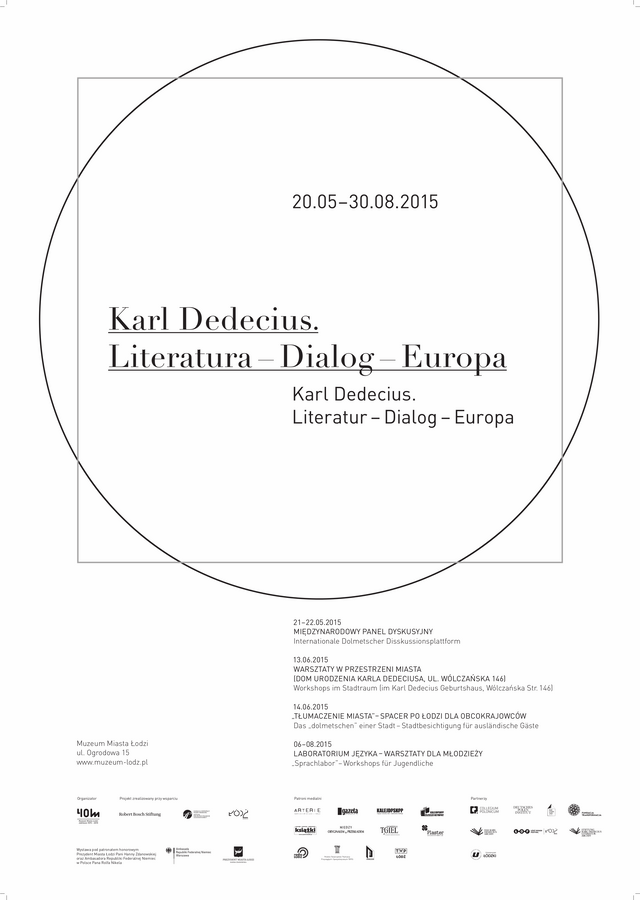 Wystawa jest częścią bilateralnych obchodów z okazji zbliżającej się 95. rocznicy urodzin tłumacza, na które złożą się także: międzynarodowy panel dyskusyjny, warsztaty w przestrzeni miejskiej oraz publikacja. Ekspozycja Karl Dedecius. Literatura – Dialog – Europa będzie prezentowana w Łodzi do 30 sierpnia, następnie odwiedzi Słubice, gdzie znajduje się Karl Dedecius Archiv (24.09-08.10.2015) oraz Darmstadt, gdzie Karl Dedecius założył Instytut Kultury Polskiej w Niemczech (maj 2016).