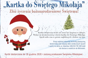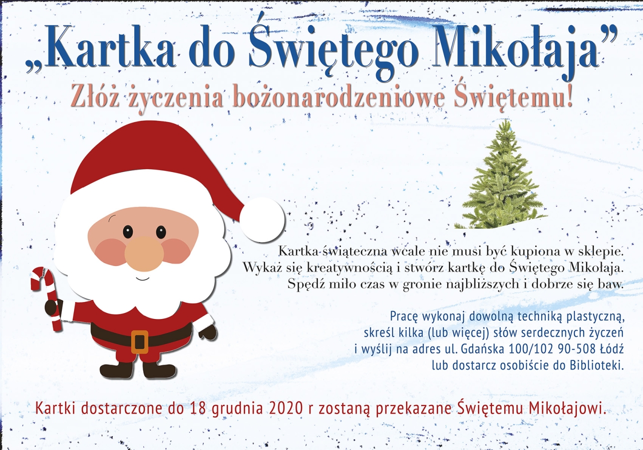 Kartka świąteczna wcale nie musi być kupiona w sklepie. Może być wykonana właśnie przez Ciebie w oryginalny sposób. Wykaż się kreatywnością i stwórz kartkę do Świętego Mikołaja. Pracę wykonaj dowolną techniką plastyczną, skreśl kilka (lub więcej) słów serdecznych życzeń i wyślij na adres ul. Gdańska 100/102 90-508 Łódź lub dostarcz osobiście do Biblioteki.Do wykonania pracy możesz zaprosić koleżankę, kolegę, siostrę, młodszego brata, rodziców, babcię i dziadka. Po prostu spędź miło czas w gronie najbliższych i dobrze się baw.