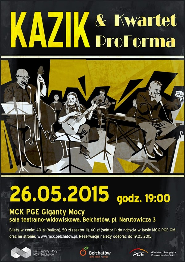 Kazik Staszewski – artysta o wielu twarzach, lider legendarnego KULTU oraz KNŻ, muzyk – instytucja, przyjedzie do Bełchatowa jako członek projektu Kazik + Kwartet ProForma. Na scenie sali teatralno – widowiskowej Miejskiego Centrum Kultury w Bełchatowie zespół zaprezentuje rzadko wykonywane dotychczas utwory z repertuaru Kazika Staszewskiego, niezapomniane szlagiery autorstwa Taty Kazika - Stanisława Staszewskiego oraz covery takich artystów, jak Nick Cave czy Tom Waits w autorskich aranżacjach. Na ich koncercie obecny był sam John Malkovich. Teraz zespół wystąpi przed bełchatowianami!